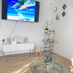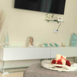 Living room with flat-screen smart tv 75 inches ready with Netflix. Balcony’s in front of the pool to relax or eat out