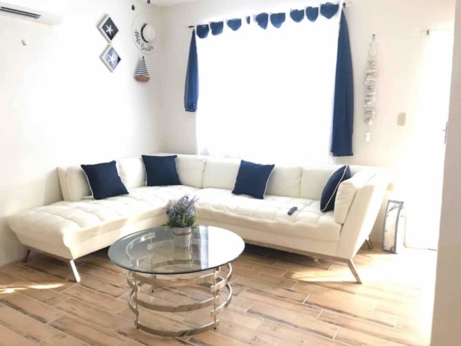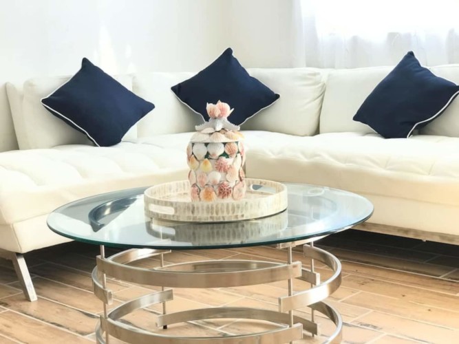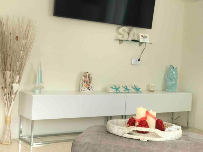 Living room with flat-screen smart tv 75 inches ready with Netflix. Balcony’s in front of the pool to relax or eat out.